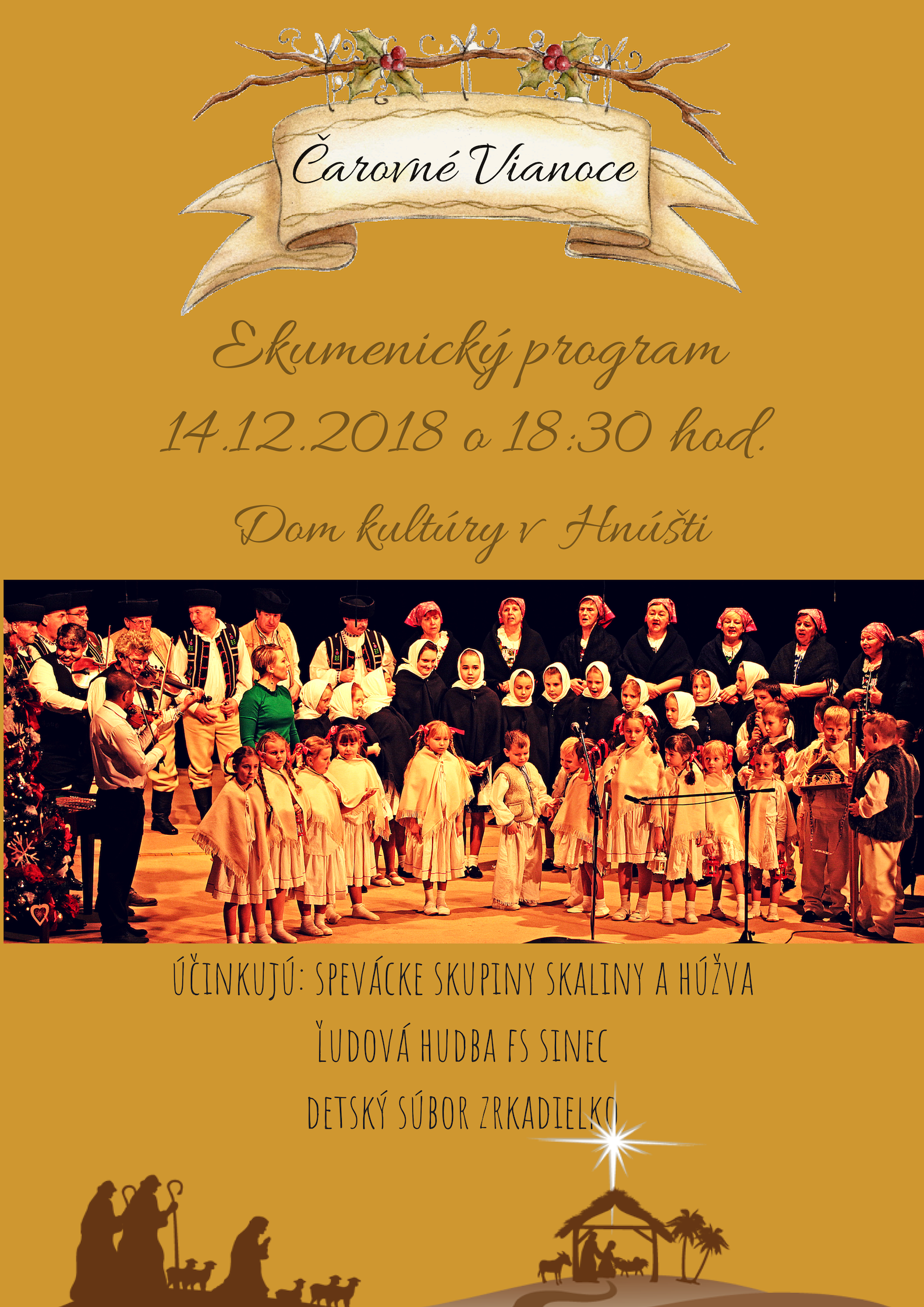 Všetci ste srdečne pozvaní na záverečný program MsKS – Čarovné Vianoce. Tento ľudovo ekumenický večer nám spríjemnia: spevácke skupiny SKALINY a HÚŽVA, ľudová hudba FS SINEC a detský folklórny súbor ZRKADIELKO. Začíname v piatok, 14. decembra od 18:30 hod. Tešíme sa na vás!