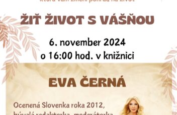Srdečne vás pozývame na autorskú beseduEVY ČERNEJ ku knihe ŽIŤ ŽIVOT S VÁŠŇOU , ktorá vás povzbudí, pohladí či motivuje.Tešíme sa na stretnutie v stredu 6.novembra o 16:00 hod. v Knižnici Prof.Š.Pasiara v Hnúšti