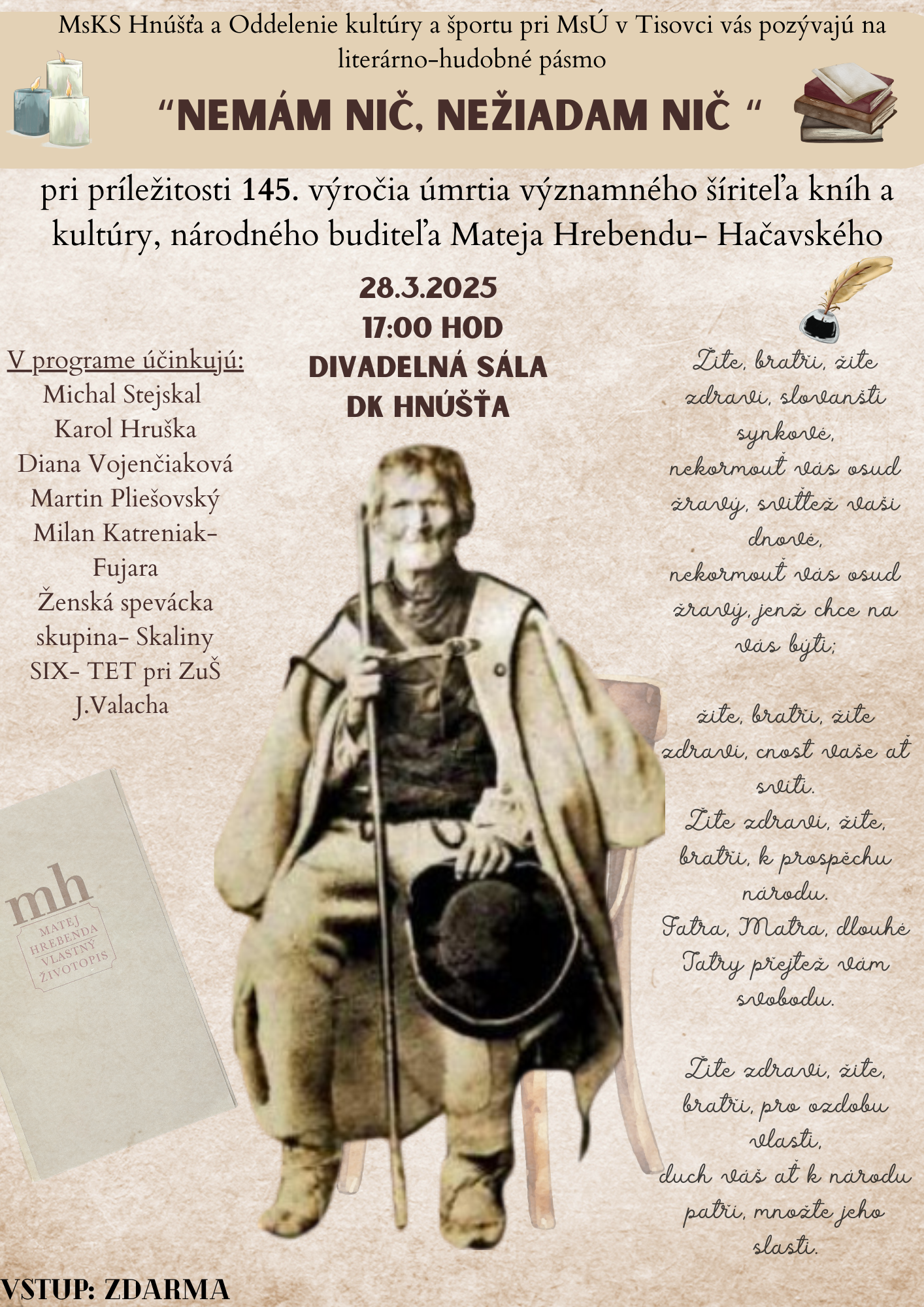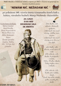 ☝️Tento mesiac – 16. marca si pripomenieme 145. výročie úmrtia Mateja Hrebendu. Pri tejto príležitosti Vás pozývame na literárno-hudobné pásmo,