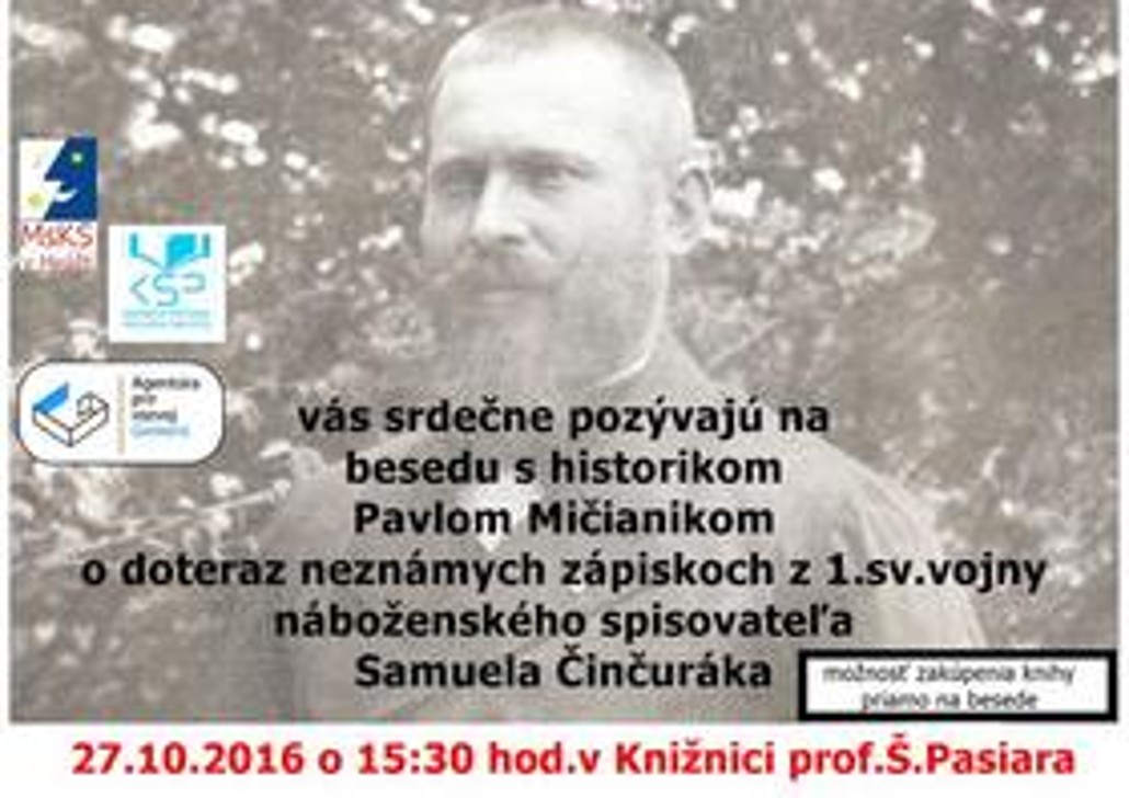 Mestské kultúrne stredisko, Knižnica prof.Š.Pasiara a Agentúra pre rozvoj Gemera vás pozývajú na besedu s historikom Pavlom Mičianikom o pozoruhodnej knihe spomienok Samuela Činčuráka
