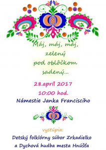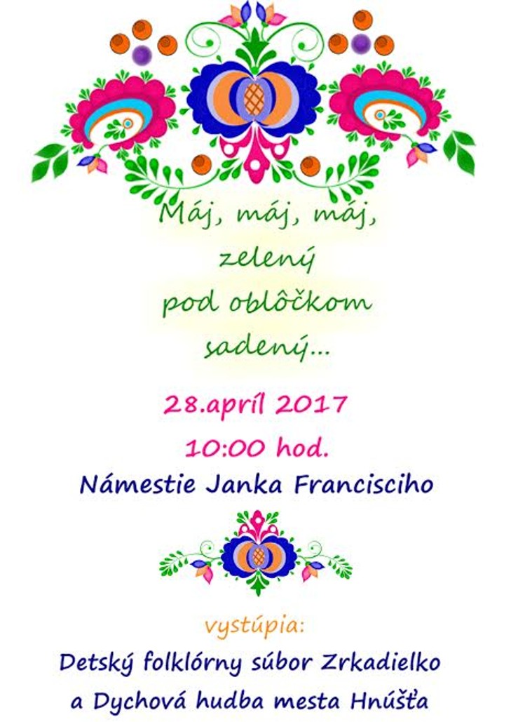 Mestské kultúrne stredisko, členovia Detského folklórneho súboru Zrkadielko a Dychovej hudby mesta Hnúšťa Vás srdečne pozývajú na tradičné stavanie mája v piatok 28.apríla 2017 o 10:00 hod. na Námestie Janka Francisciho.